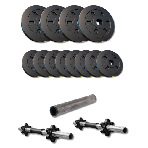 Комплектація | Диски Besport PowerPro: 1,25 кг – 8 шт 2,5 кг – 4 шт Гриф: Гриф гантельний 45 см - 2 шт Перехідник під штангу: Довжина: 32 см |