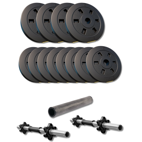 Комплектація | Диски Besport PowerPro: 2,5 кг – 8 шт 5 кг - 4 шт Гриф: Гриф гантельний 45 см - 2 шт Перехідник під штангу: Довжина: 32 см |