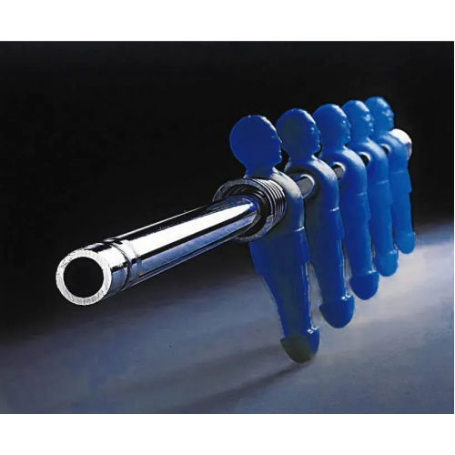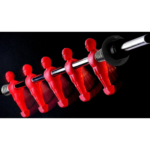 | Особливості. | Стальні підшипники всередині пластикових фіксаторів, що кріплять штанги до корпусу, значно підвищують швидкість гри, знижуючи навантаження на зап'ястя. Фігурки гравців міцні та довговічні, виготовлені з високоякісного пластику марки Moplen, одного з провідних виробників полімерів у світі. Мʼяч вводиться в гру через воронку з кожної сторони столу. Швидке та легке вилучення м'яча після гола через відсік за воротами. Наочний підрахунок голів та очок, реалізований за допомогою пластикових лічильників із червоними та синіми кубиками. |