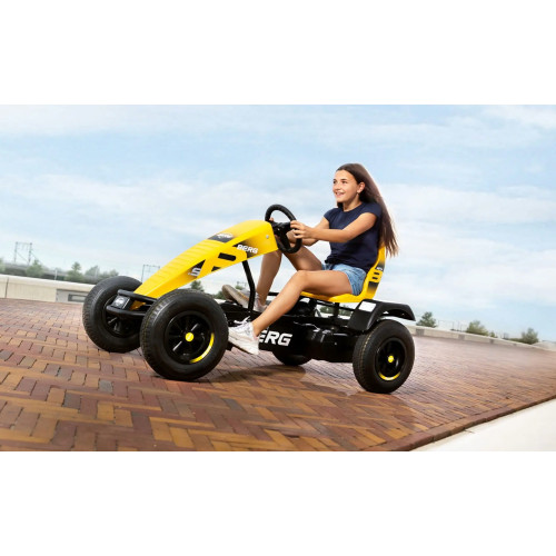 Веломобиль BERG XXL B. Super Yellow E-BFR — это яркий жёлтый педальный карт с усиленной рамой для подростков и взрослых, созданный для максимальной устойчивости, безопасности и удовольствия от езды. Модель оснащена инновационной системой привода E-BFR, которая сочетает классическое педалирование с электрической поддержкой. Благодаря этому веломобиль легко разгоняется и помогает ехать быстрее даже на подъёмах, при этом управление остаётся простым и интуитивным. Тормозить можно педалями или ручным тормозом — всё продумано для максимального контроля.